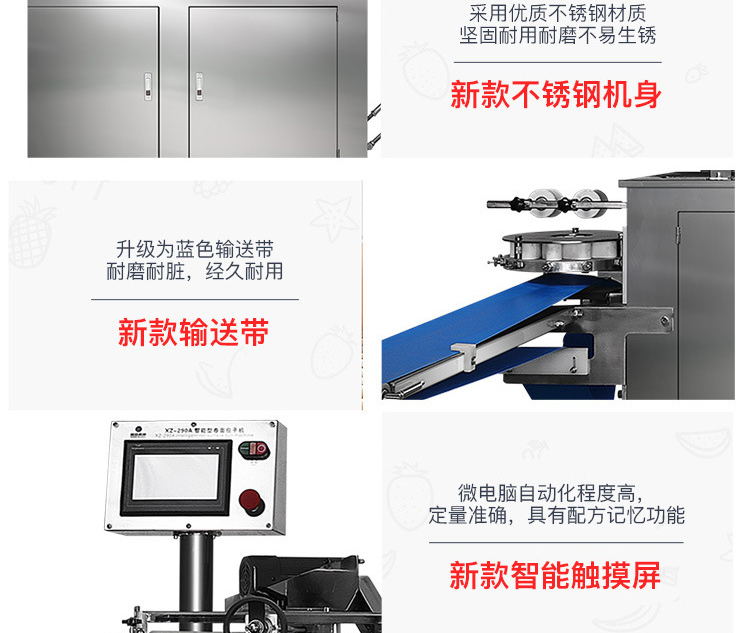 XZ-290A智能型卷面式包子機是一款以壓面方式成型面皮,卷面方式包餡,仿手工捏花的一款機型,它整合了原有的二道壓面、成型機、出餡機、切刀為一體,有操作方便、占地面積小等優(yōu)點。該機采用壓面成型面皮的方式,表面光潔,不傷面筋,不發(fā)熱,使產(chǎn)品口感滑順爽口,保持傳統(tǒng)手工工藝的風(fēng)味,本機采用自動控制系統(tǒng),品質(zhì)穩(wěn)定,壓面滾筒采用性能好的食品級材料UPE加工而成,且增大了滾簡直徑使得在壓面過程中面皮的精度更高,產(chǎn)品重量精度更高,規(guī)格,長度,大小,面皮的厚度皆可調(diào)整設(shè)定。