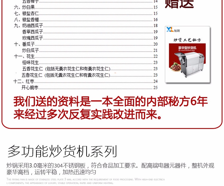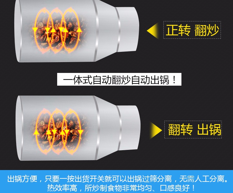 9.豪華炒貨機(jī)結(jié)構(gòu)合理,操作簡單,熱效率高,所炒制食物非常均勻、口感良好!