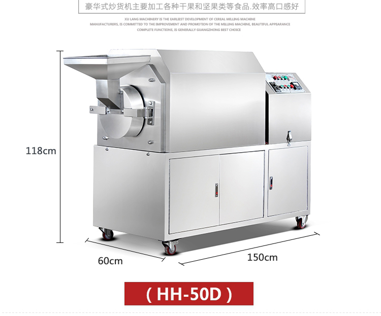HH豪華炒貨機(jī),適合加工各種干果和堅果類,如;板栗、花生、瓜子、松籽、榛子、杏仁、菜籽、咖啡豆、紅棗、芝麻、核桃、各種豆類、麥類、米類等。適用于在食品加工廠、農(nóng)貿(mào)市場、食品專賣店、連鎖店等處定點加工和經(jīng)營,符合生產(chǎn)、創(chuàng)業(yè)致富的需要。