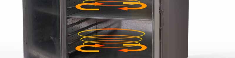 本運(yùn)風(fēng)箱分水平對(duì)流式和上下對(duì)流式兩種。工作室較小的采用水平對(duì)流式,發(fā)熱部分在上部,工作室較大的則采用上下對(duì)流式,發(fā)熱部分在上部。電機(jī)安裝在上部或后部,通過帶動(dòng)風(fēng)輪將熱量流通到工作室,如此循環(huán)。