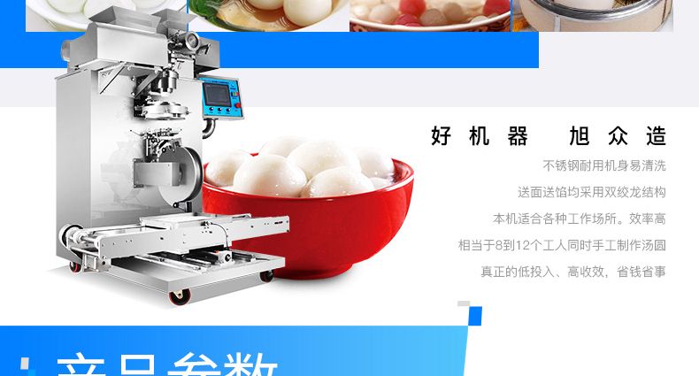 本機(jī)工作效率高,相當(dāng)于8-12個(gè)工人同時(shí)手工制作湯圓,真正的低投入、高收效、省錢省工。本機(jī)對(duì)面粉質(zhì)量要求不高,適合各種工作場所。本機(jī)提供免費(fèi)上門培訓(xùn)指導(dǎo)、安裝、調(diào)試、面點(diǎn)工藝傳授。