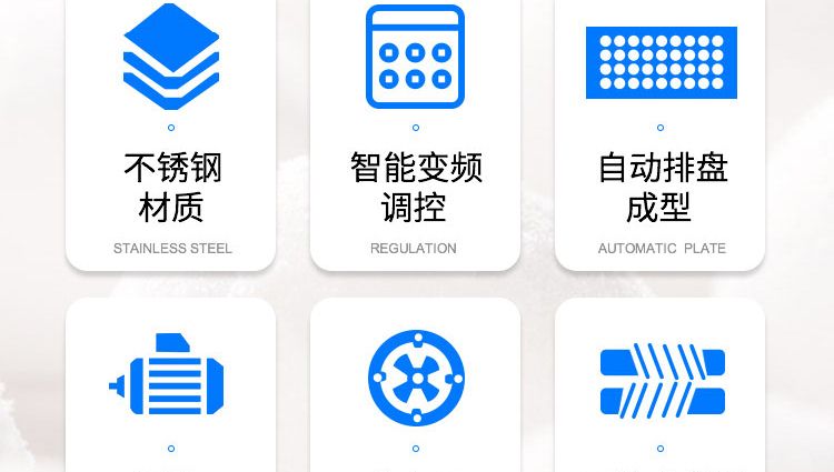 ◆觸摸屏自動(dòng)控制搓圓擺盤一體成型技術(shù),使得制品外形美觀,大小均勻,表面光亮細(xì)膩、口感柔滑,彈韌性佳;