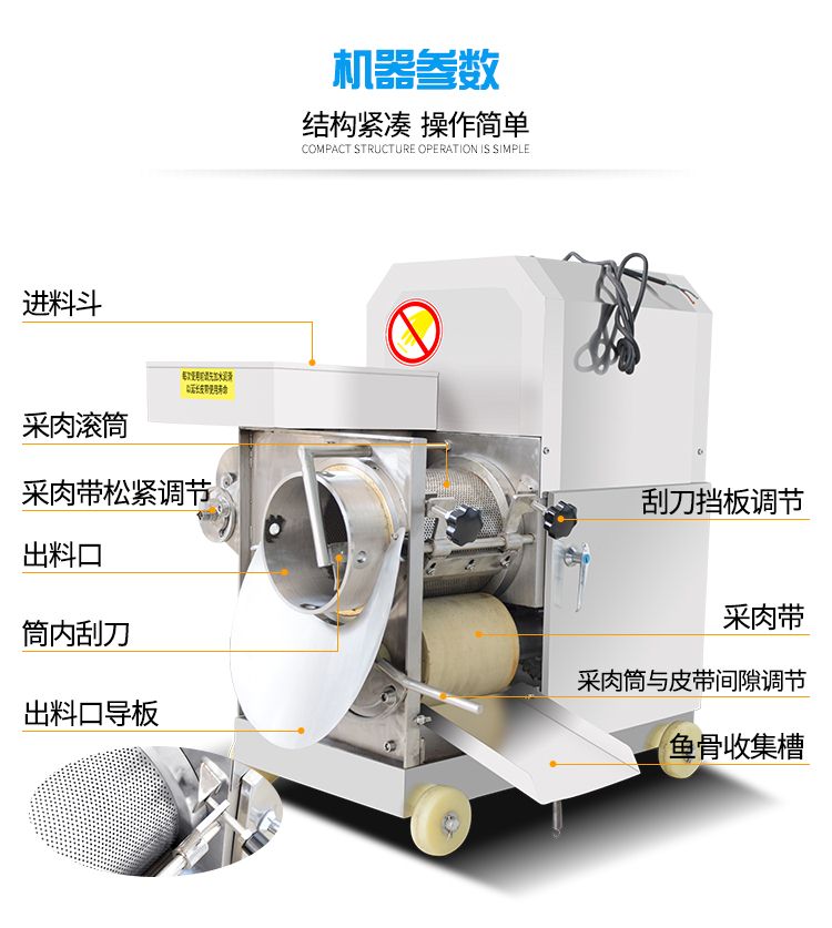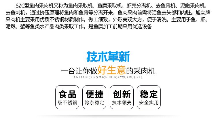 旭眾XZC系類魚肉采肉機是一款專業(yè)加工魚肉去刺、蟹蝦去殼的機械,由于隨著市場的發(fā)展,人們生活中漸漸離不開有魚的生活,無論是家里、飯店等魚都是主要的食物還有現(xiàn)在一些休閑食品中都是離不開魚加工后的魚泥。魚肉采肉機的研制成功給人們生活中帶來很多方便,無論是您做魚丸、魚餡等只需要一款魚肉采肉機就可以實現(xiàn),對于大量生產(chǎn)即降低了人工成本,又提高了生產(chǎn)效率。