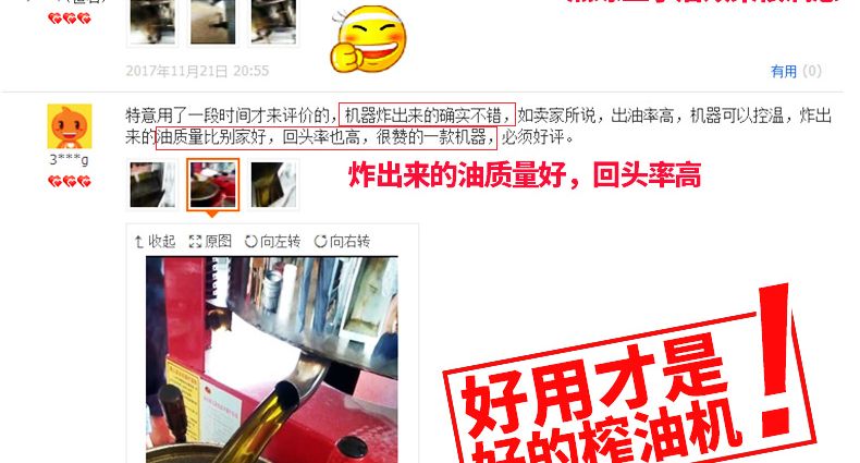 重要提示:離心濾油機(jī)建議配XZ-LL100(離心濾油機(jī)需要加鹽水濾油,該機(jī)通過(guò)高速旋轉(zhuǎn)產(chǎn)生離心力,使比重不同的液體與固體自動(dòng)分離,從而達(dá)到油渣分離。),正壓濾油機(jī)建議配XZ-ZL2(正壓濾油是與空氣壓縮機(jī)組合,如果給客戶配正壓濾油機(jī)需要買(mǎi)個(gè)空壓機(jī)。正壓濾油油桶內(nèi)的毛油處于密閉狀態(tài)時(shí),壓縮空氣送入桶內(nèi)形成一定壓力,使其強(qiáng)行通過(guò)濾布。)榨油機(jī)如有榨較硬的物料如山茶籽一定要用518以上而且是-2的設(shè)備(客戶榨山茶籽和硬物料推薦用-2設(shè)備,如果榨花生菜籽等高油較軟的物料請(qǐng)推薦-4設(shè)備)。